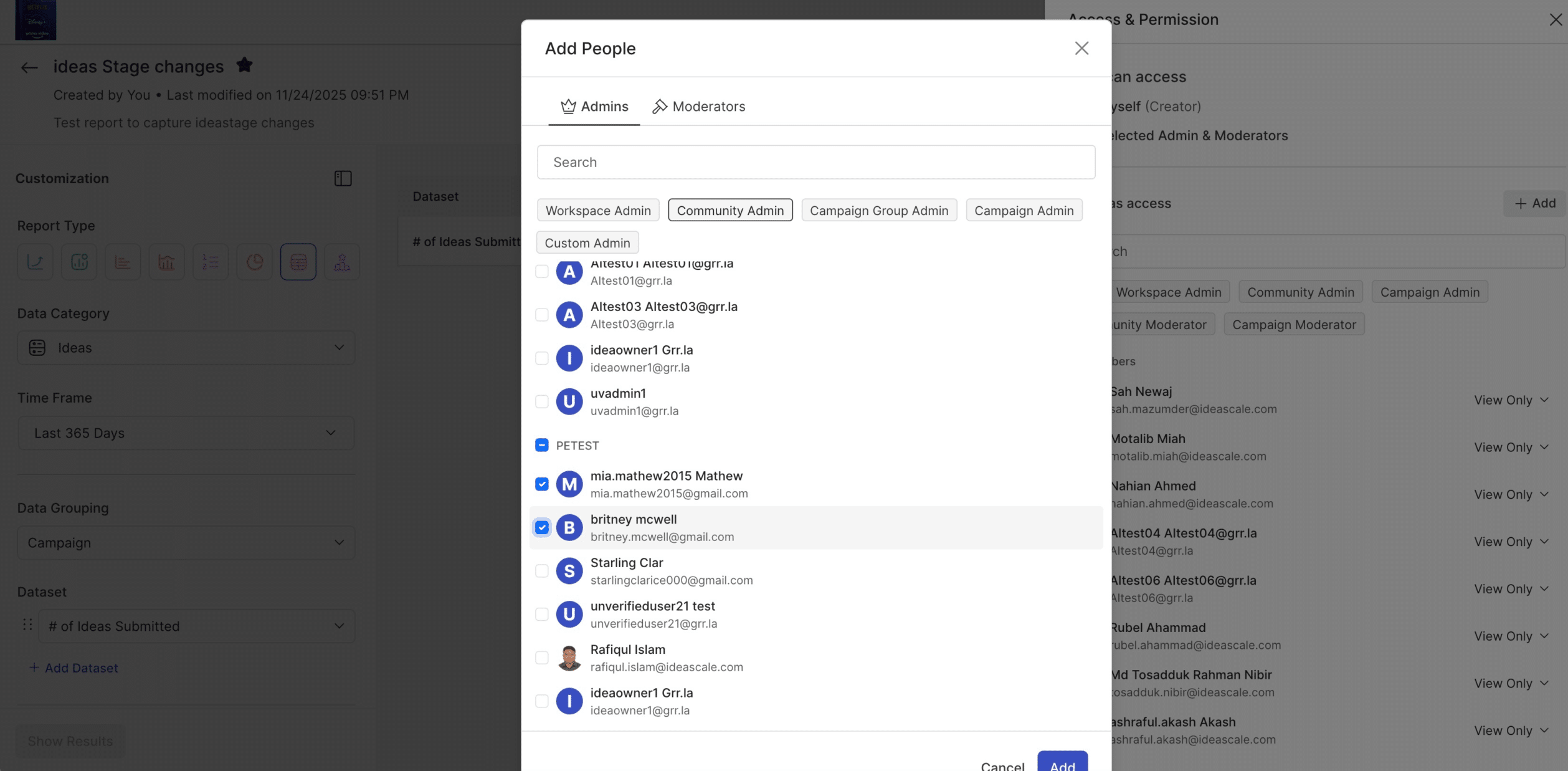 Until now, sharing analytical insights in IdeaScale meant working around limitations. You could build a powerful dashboard, but getting it into the hands of the right stakeholders required workarounds. That changes with this release. IdeaScale now supports granular sharing and permissions for both reports and dashboards. Administrators and report owners can add specific people to a report or dashboard with defined permission levels, controlling who can view and reshare. Filter permissions are handled intelligently too: when a shared report includes filters that reference data the recipient doesn’t have access to, the system resolves the conflict rather than breaking the view.