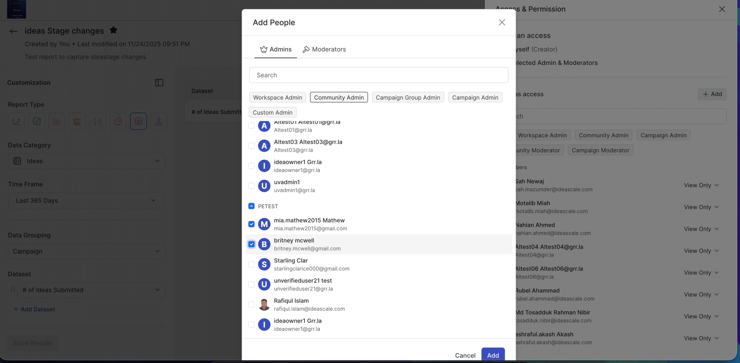 Until now, sharing analytical insights in IdeaScale meant working around limitations. You could build a powerful dashboard, but getting it into the hands of the right stakeholders required workarounds. That changes with this release. IdeaScale now supports granular sharing and permissions for both reports and dashboards. Administrators and report owners can add specific people to a report or dashboard with defined permission levels, controlling who can view and reshare. Filter permissions are handled intelligently too: when a shared report includes filters that reference data the recipient doesn’t have access to, the system resolves the conflict rather than breaking the view.